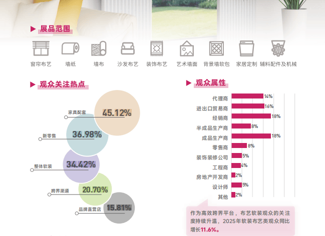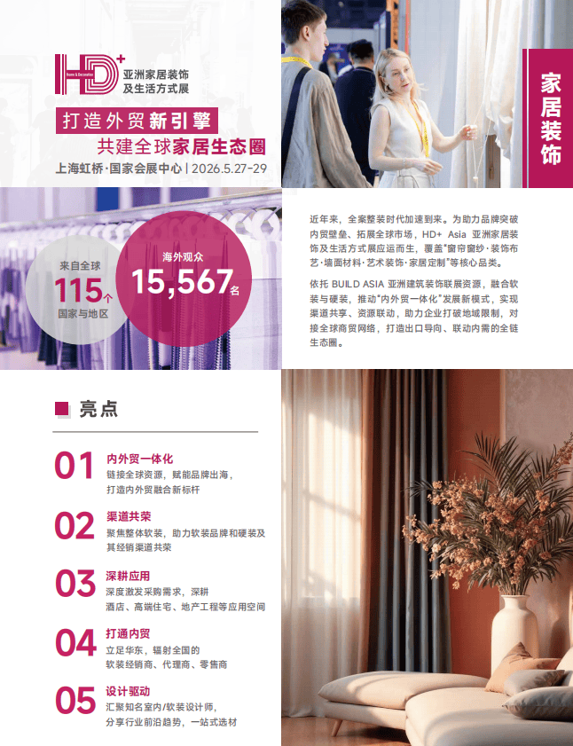 HD+ Asia 的出生,正照应了“全案整装”的时间趋向。它不再限定于古代的窗帘布艺,而是依托于BUILD ASIA亚洲修造点缀联展的重大后台,将前端的策画、硬装与后端的软装、家居完好协调。这意味着,展会现场将集聚从地产拓荒商、点缀工程公司到经销商、策画师的全链道决议者,实行真正的渠道共享与跨界合营。